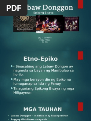 4112010 Labaw Donggon Epikong Bisaya Si Labaw Donggon ay anak ni Anggoy Alunsina at Buyung Paubari. Narito ang ilan sa mga halimbawa ng epiko ng Pilipinas at sa mundo. Maraming makikisig na diyos sa ibat ibang bahagi ng daigdig ang.