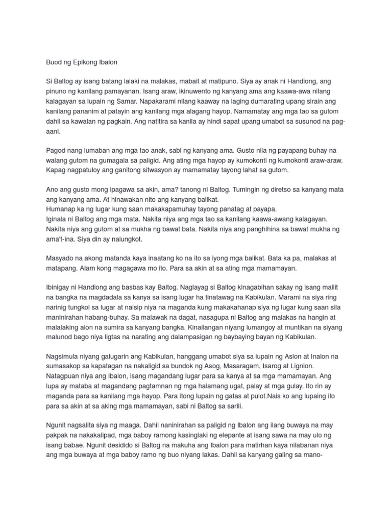 Paghahambing o pagtutulad ng epiko sa alamat. Ang epikong Ibalon ay isang salaysay ng pakikipagsapalaran ng mga bayaning sina Baltog Handiong at Bantong. Kahulugan at aral ng idarapatra at sulayman kabanata tagalog.