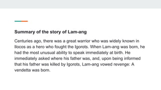 Summary of the story of Lam-ang Centuries ago there was a great warrior who was widely known in Ilocos as a hero who. His bones were recovered by Marcos and Ines covered them with a piece of cloth. After his death due to being eaten by a huge fish Lam-angs bones are.