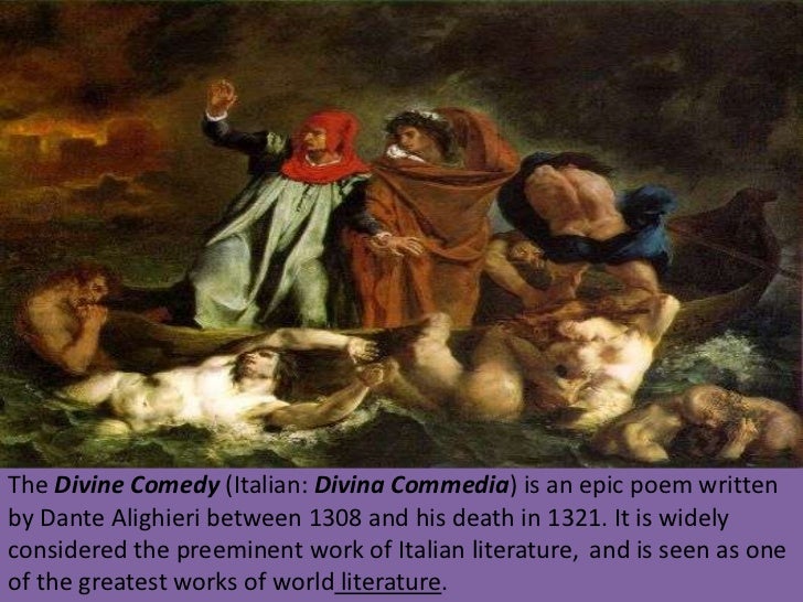 Ang kilalang epiko ni Dante ay ang The Divine Comedy. 1308 at nakumpleto noong 1320 isang taon bago siya mamatay noong 1321. Sa kabila ng kaiklian buhay ang paglalarawan at buong nailalahad ang mga susing pangyayari sa buhay ng pangunahing tauhan at taglay nito ang kakintalan sa diwa ng mga mambabasa.