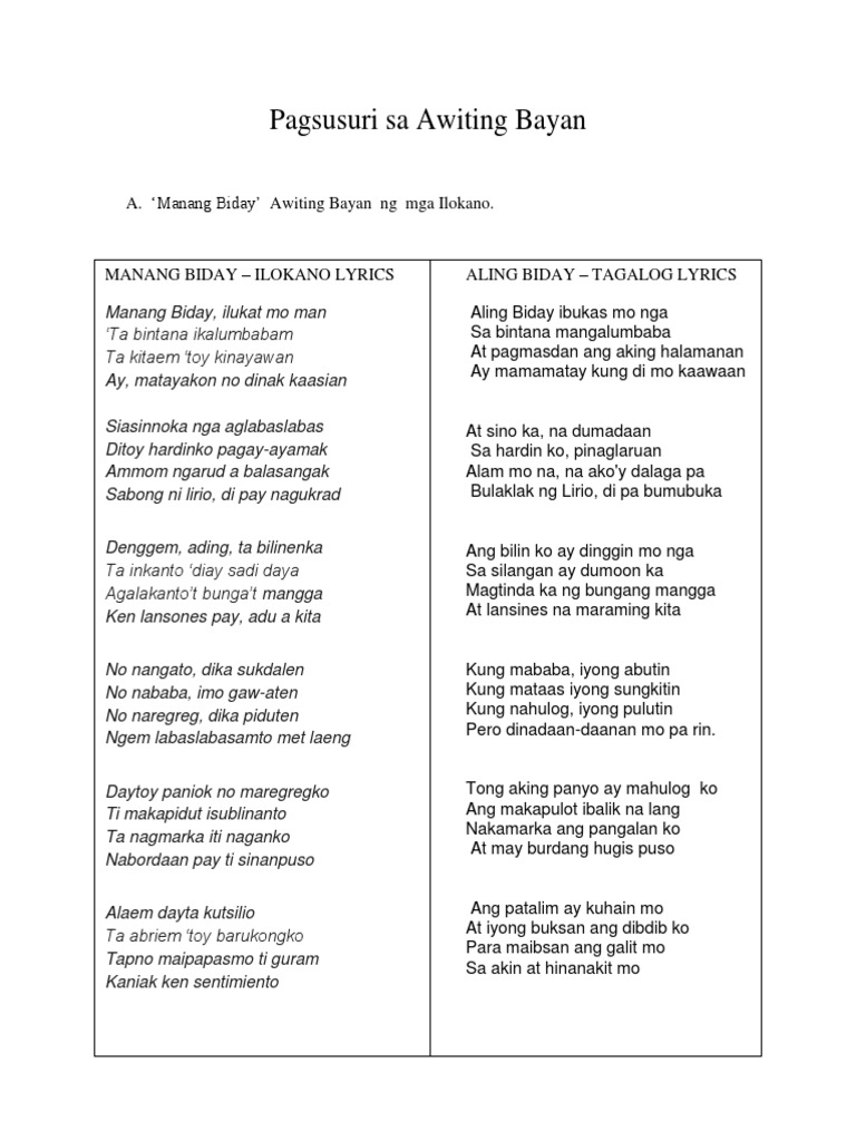 Manang Biday is a traditional Ilocano folksong in Northern Luzon particularly in the province of Ilocos. Ang makahanap ay ibalki sa akin. Until today it is still practiced by the Ilocano.