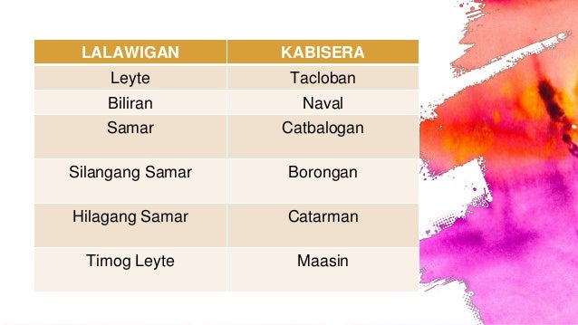 Biag ni Lam-ang Nagmula sa lalawigan ng Ilocos. Mga pangunahing produkto ng 8. Ang rehiyon ng Leyte Dating Silangang Visayas InglesEastern Visayas ay isa sa mga rehiyon ng Pilipinas ay tinatawag na Rehiyon VIIIBinubuo ito ng anim na lalawigan.