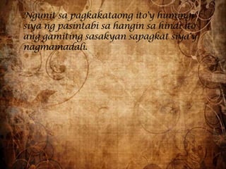 Isang Araw tumanggap si Tuwaang ng balita na may isang dilag na nagmula sa kalangitan ng Buhong na nakarating sa kaharian ni Batooy upang humingi ng tulong. Ilan sa mga ito ay ang Ibalon ng Bikol Hudhud ni Aliguyon ng mga Ifugao Biag ni Lam-Ang ng Ilocos at Tuwaang ng mga Bagobo at marami. - kabalangkas ng Epikong pambayani ngunit ang paksa ay naglalahad na kutyain ang gawaing walang kabuluhan at pag-aaksayahan lamang ng panahon ng tao.