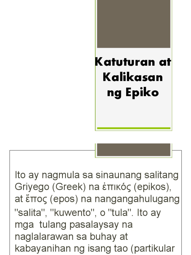 At may kahalong pilosopiya sa buhay. Epiko Tulang nagsasalaysay ng mga pangyayari. Anupat naiiba ito sa trahedya na naglalayong pumukaw sa pagkasindak at pagkaawa ng taoPinakamahalaga rito ay ang pagtatagumpay laban sa suliranin lalong magaling kung ganap ang pagtatagumpay laban sa.