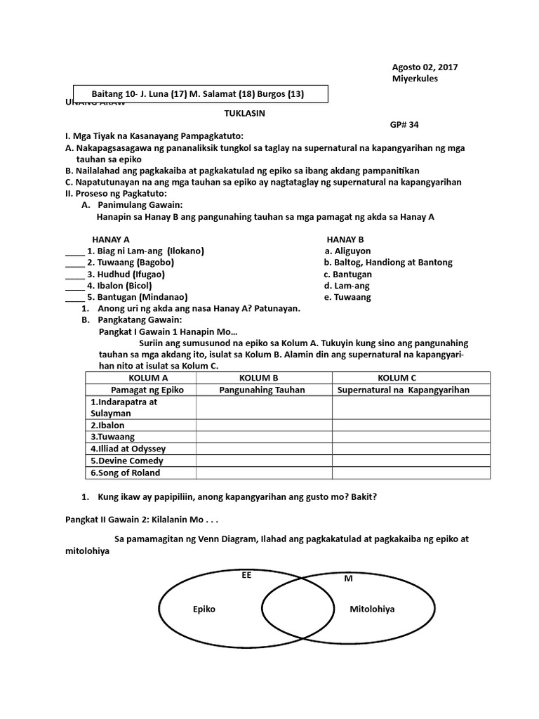 Gawain 1 Hanapin Mo Suriin Ang Sumusunod Na Epiko Sa Kolum A Tukuyin Kung Sino Ang Pangunahing Brainly Ph
